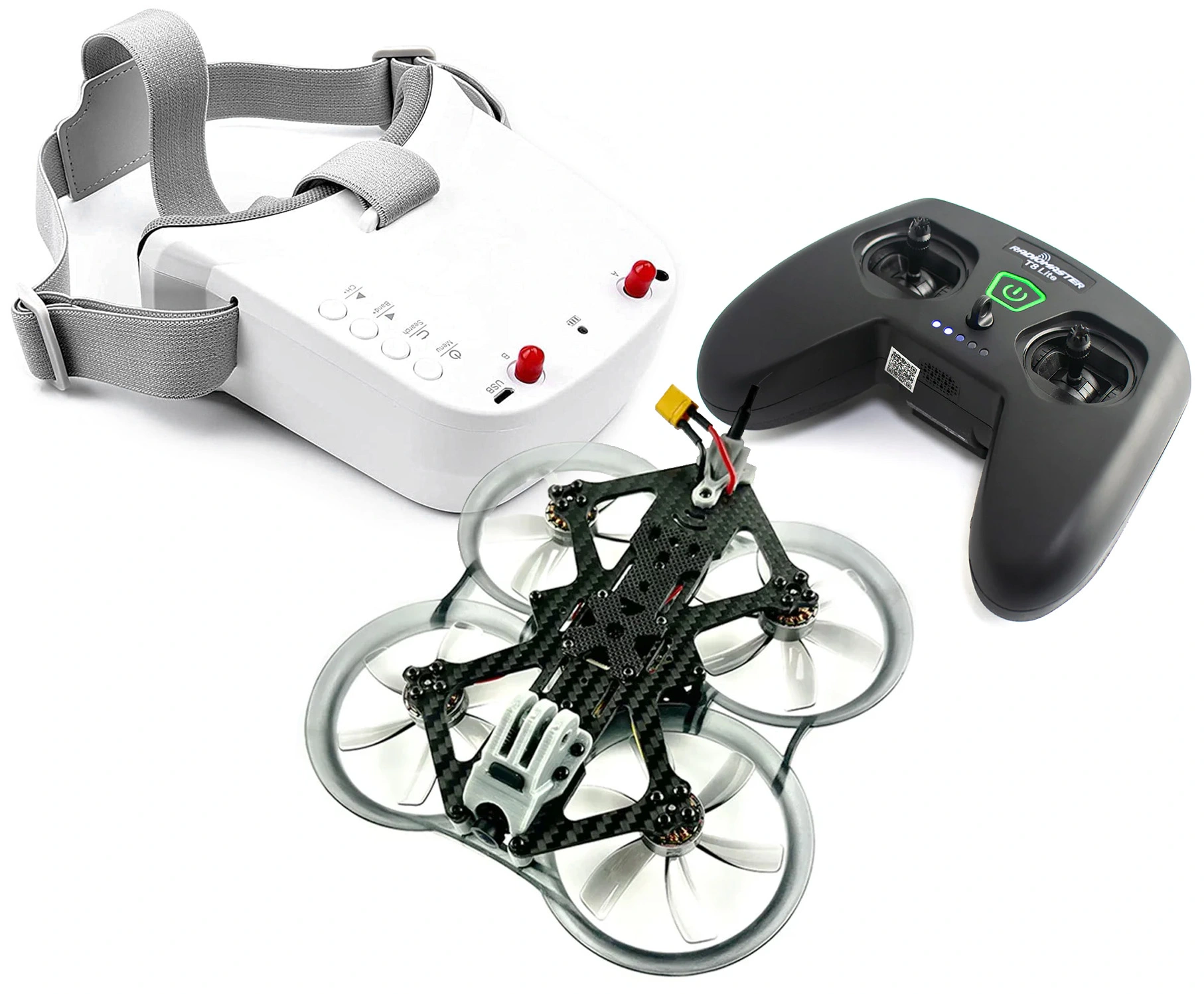 Набор включает в себя все необходимые компоненты для сборки квадрокоптера, включая раму, моторы, электронику, камеру и вещательное оборудование. Также в комплекте идет пульт управления, аккумулятор, зарядное устройство и даже запасные пропеллеры.
