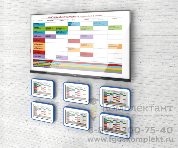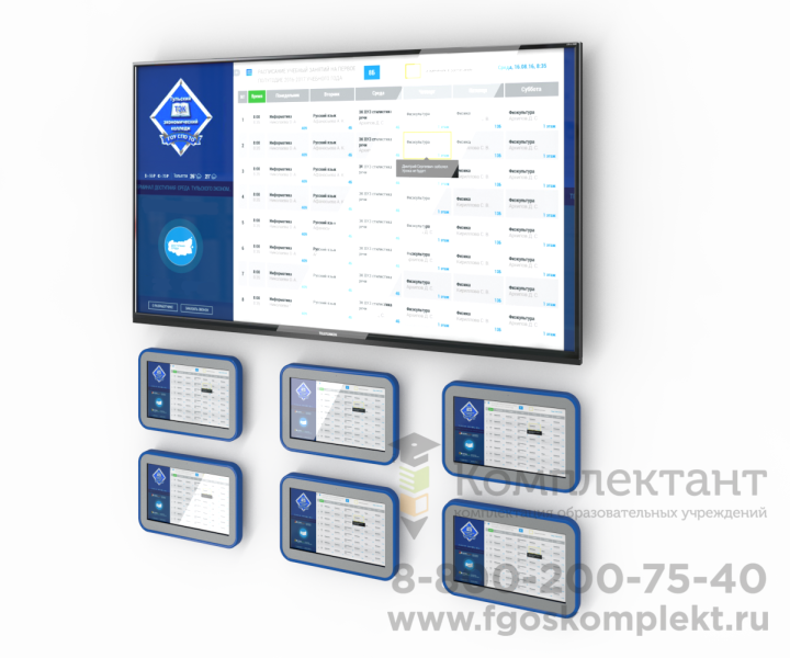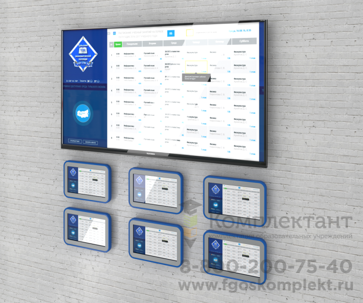 Интерактивное расписание предназначено для просмотра расписания (для школ, Вузов). Благодаря 6-ти дополнительным сенсорным мониторам диагональю 15" , с дублированием информации, которые устанавливаются на разных этажах учреждения, ученики всегда будут знать актуальную информацию.