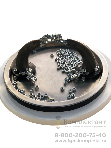Экспонат 1 предназначен для практического изучения взаимодействия магнитного поля разнополюсных магнитов. Посетитель с помощью гаек может создавать разнообразные формы в зазоре между двумя магнитопроводами. В комплект входит 100 гаек.