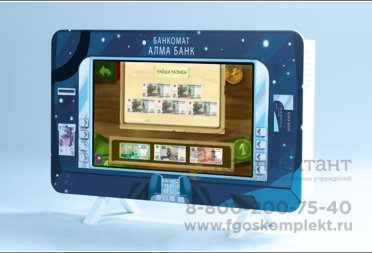 Интерактивный терминал банкомата с диагональю экрана 25 дюймов, поддержкой одновременной работы до 4 детей, прочным корпусом и экраном, тематическим оформлением в виде банкомата.
