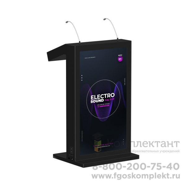 Мы разработали особую модель интерактивной трибуны – с большим внешним дисплеем, на котором можно демонстрировать ролики, презентации, логотипы спонсоров и т.д. Трибуна оснащена двумя микрофонами, сенсорным дисплеем для спикера и набором разъемов для подключения дополнительной аппаратуры.