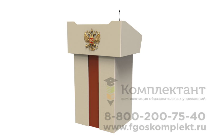 Корпус трибуны выполнен из ламинированной ДСП на четырех поворотных колесах, что делает ее мобильной. По запросу клиента на корпусе располагается герб РФ либо логотип учреждения. Цвет корпуса также выбирается заказчиком.