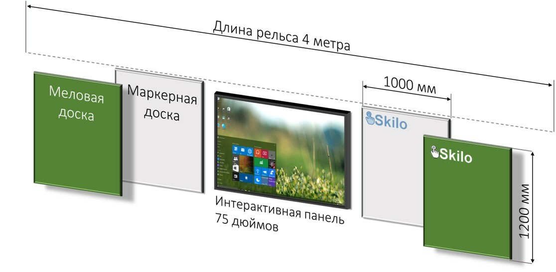 Комбинированные доски - меловые и маркерные в раздвижном комплекте с интерактивной панелью 75 дюймов.