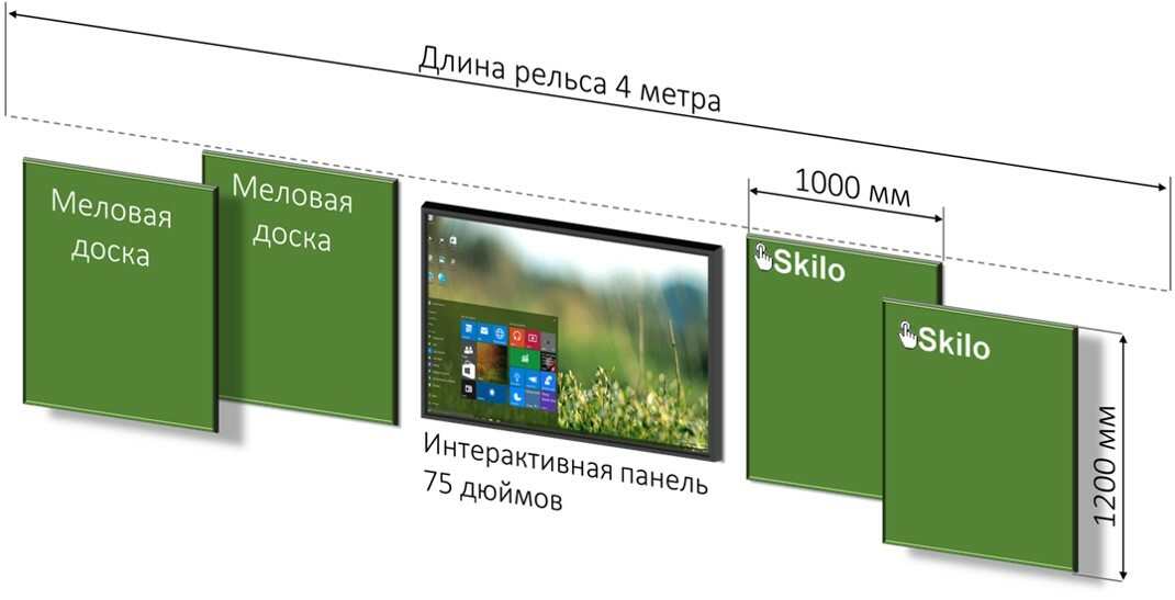 Рельсовый комплект с интерактивной панелью 75 дюймов. Работа преподавателя становится более удобной за счёт совмещения мультимедийных возможностей и меловых поверхностей.