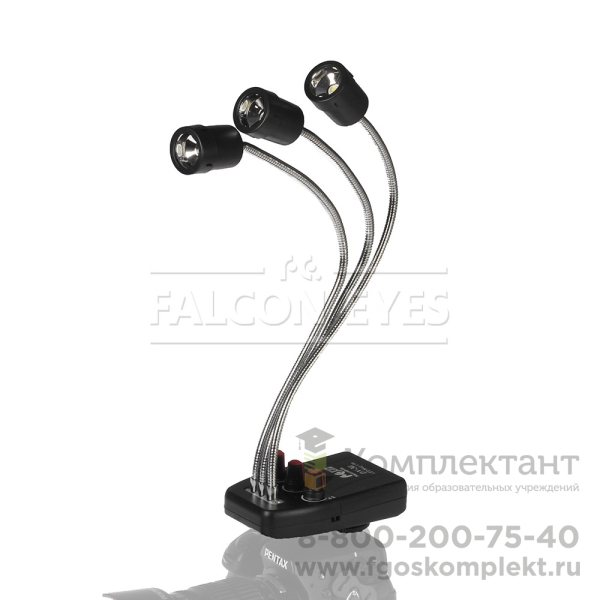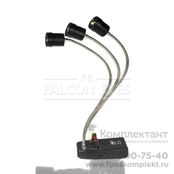 Устройство состоит изтрех точечных (ОТДЕЛЬНО регулируемых, как помощности так иуглу рассеивания светодиодных) осветиетелей мощностью 1 Вт, помещенных нагибких кронштейнах. Блок управлеения устанавливается нагорячий башмак фотоаппарата или любую другую консоль сподобным креплением. Вкомплект поставки входят различные фильтры инасадки для изменения температуры истепени рассеивания светового потока. Прибор работает от4 пальчиковых батареек типаАА.