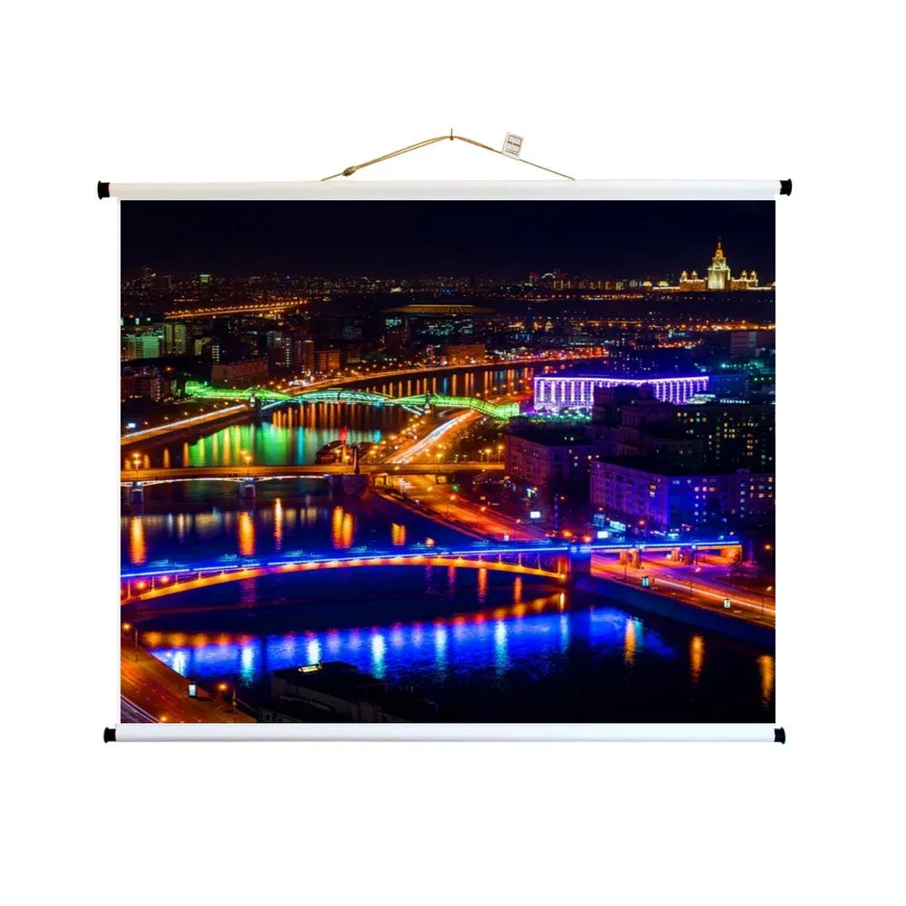 Благодаря гибкой системе размещения вы можете легко повесить экран на стену, потолок и любую другую точку опоры за регулируемый по длине трос. В случае необходимости можно в любой момент снять экран и/или свернуть в компактный рулон. В комплект входят удобные липучки для фиксации экрана в свернутом положении