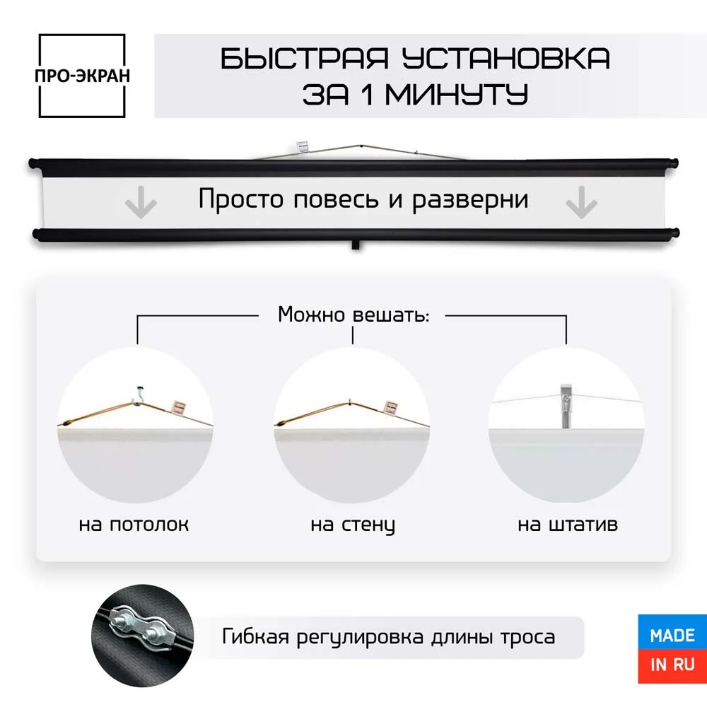 Благодаря гибкой системе размещения вы можете легко повесить экран на стену, потолок и любую другую точку опоры за регулируемый по длине трос. В случае необходимости можно в любой момент снять экран и/или свернуть в компактный рулон. В комплект входят удобные липучки для фиксации экрана в свернутом положении