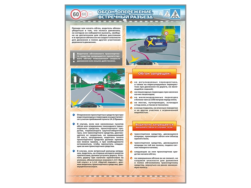 Стенд представляет собой информационную панель, на которой размещены сведения об обгоне, опережении и встречном разъезде транспортных средств.
