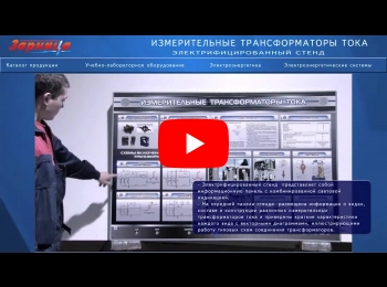 Электрифицированный стенд представляет собой информационную панель с комбинированной световой индикацией. На передней панели стенда размещена информация о видах, составе и конструкции различных измерительных трансформаторов тока и приведены краткие характеристики каждого вида с векторными диаграммами, иллюстрирующими работу типовых схем соединения трансформаторов. В конструкцию учебного оборудования интегрированы высокочувствительные сенсоры для управления стендом при помощи интерактивного магнитного воздействия приемо-передающих устройств во время обучающего процесса и проведения тестовых заданий.