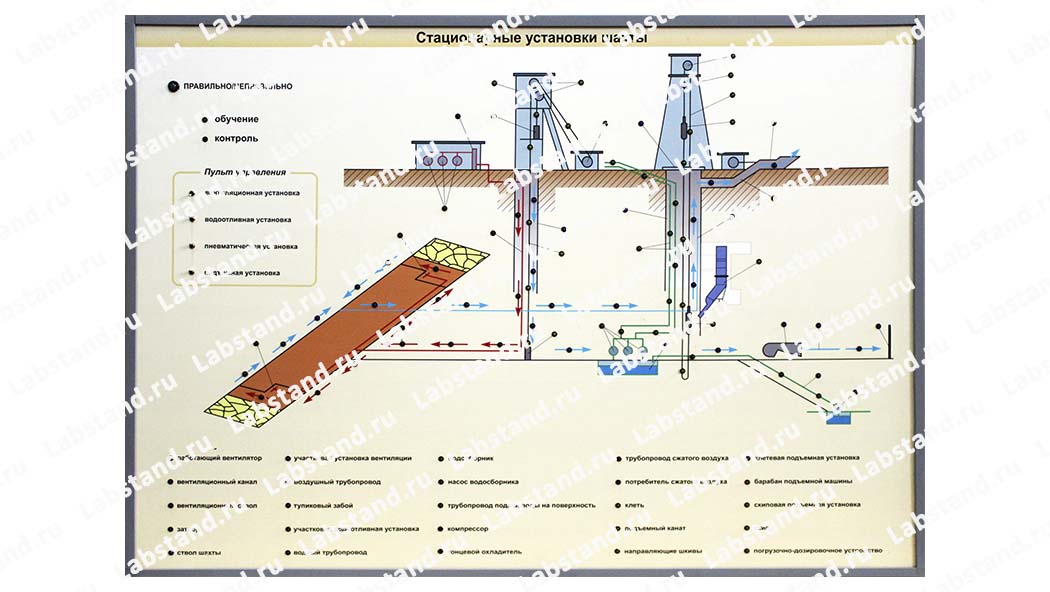 Назначение: Светодинамический стенд-планшет «Стационарные установки шахты» предназначен для освоения различных видов стационарных установок шахты, их назначения и принципа действия в профильных учебных заведениях.