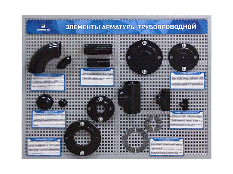 Учебное оборудование представляет собой стенд с расположенными на нем элементами арматуры трубопроводной с краткими техническими характеристиками.