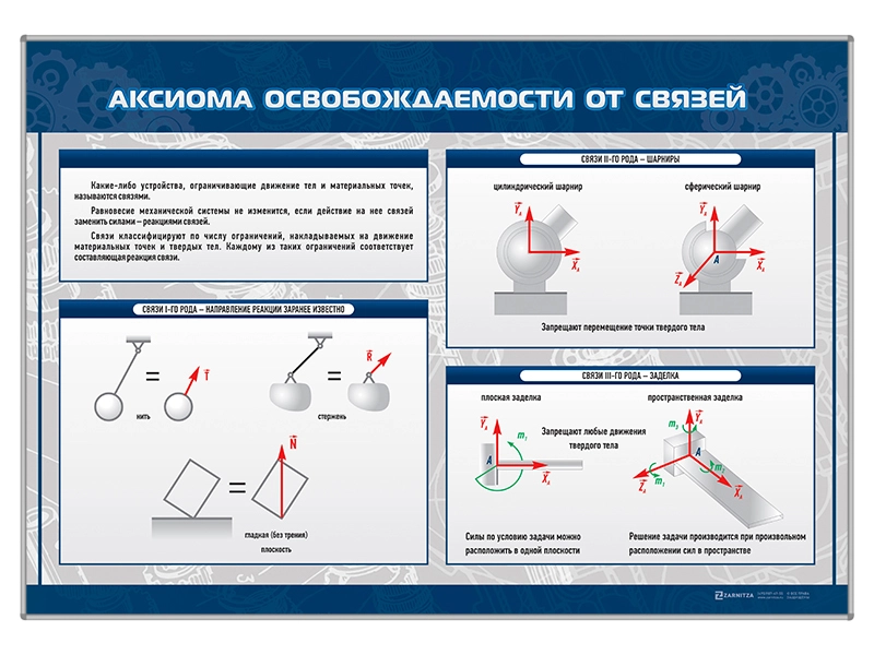 Комплект стендов "Теория механизмов и машин" представляет собой информационные панели, на которых размещены справочные и графические материалы по основным разделам теории машин и механизмов.