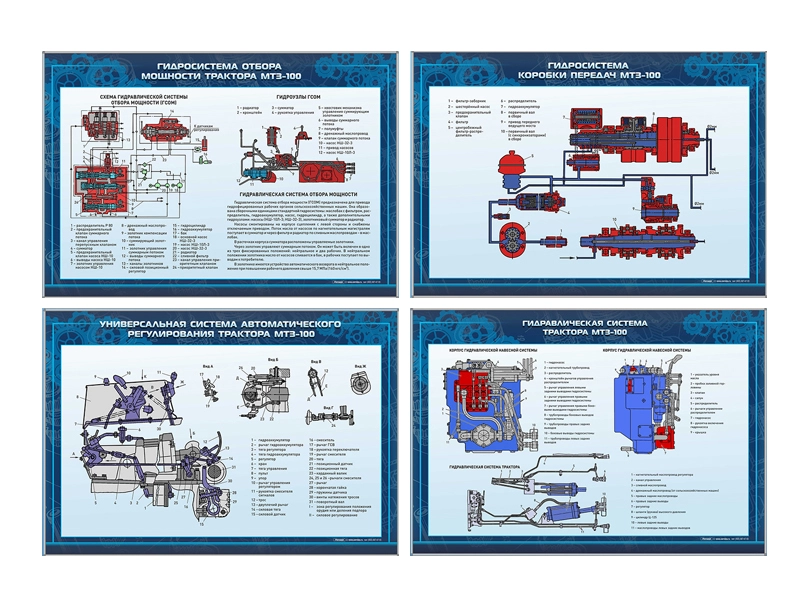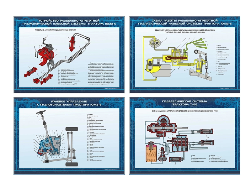 Комплект стендов «Гидросистемы тракторов» представляет собой комплект информационных панелей, на которых размещены рисунки, схемы, таблицы, графики и формулы по курсу "Устройство автотракторной техники".