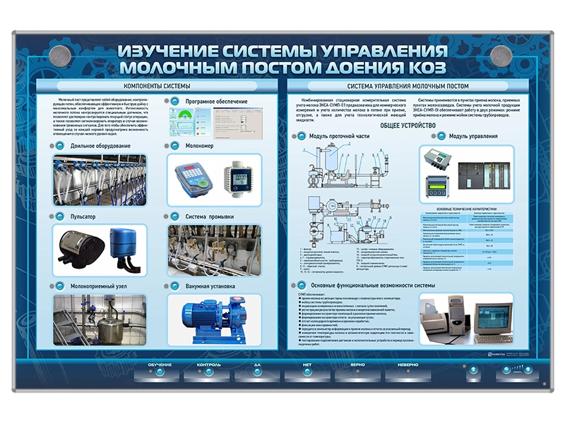 Электрифицированный стенд предназначен для получения знаний об устройстве системы управления молочным постом доения коз, его основных конструктивных элементах.