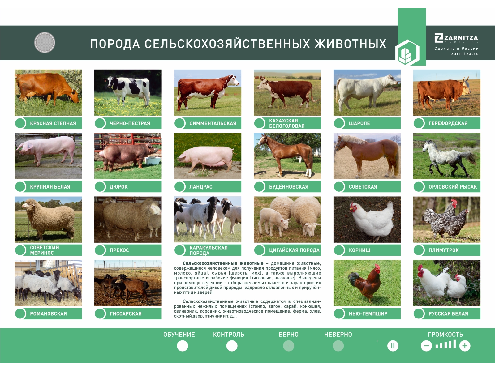 Электрифицированный стенд представляет собой информационную панель с раздельной световой индикацией. На стенде представлены полноцветные изображение, отображающее основные понятия о породе сельскохозяйственных животных. В конструкцию учебного оборудования интегрированы сенсоры с датчиками, настроенными на касание руки человека, для управления стендом при помощи воздействия приемо-передающих устройств.