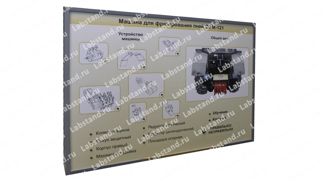 Назначение: Стенд-планшет предназначен для изучения принципа действия приборов и составных элементов машины для фрезерования пней ДЭМ-121 в учебном курсе «Почвообрабатывающие машины».