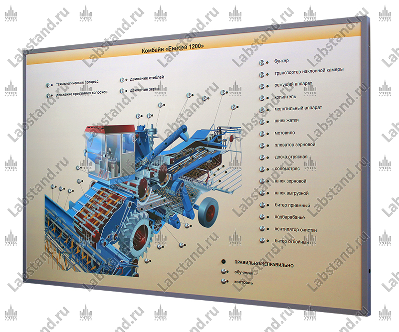 Назначение: Стенд-планшет предназначен для изучения принципа действия приборов и составных элементов комбайна Енисей 1200 в учебном курсе «Уборочные машины».