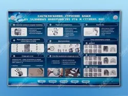 Стенд предназначен для изучения материала по теме «Дактилоскопия», а также информации по строению кожного покрова на ладонных поверхностях рук и ступнях ног курсантами специализированных учебных заведений.