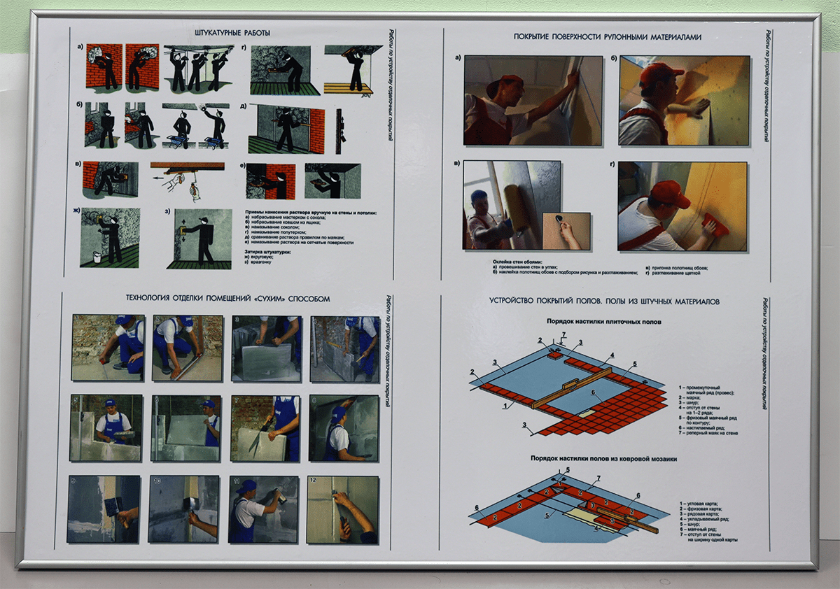- Макеты стен с отделкой штукатурки – кирпичные стены, стеновые перегородки из ГКЛ. Макеты позволяют поэтапно изучить процесс подготовки стен, нанесение штукатурных смесей различными способами, финишную отделку стен.