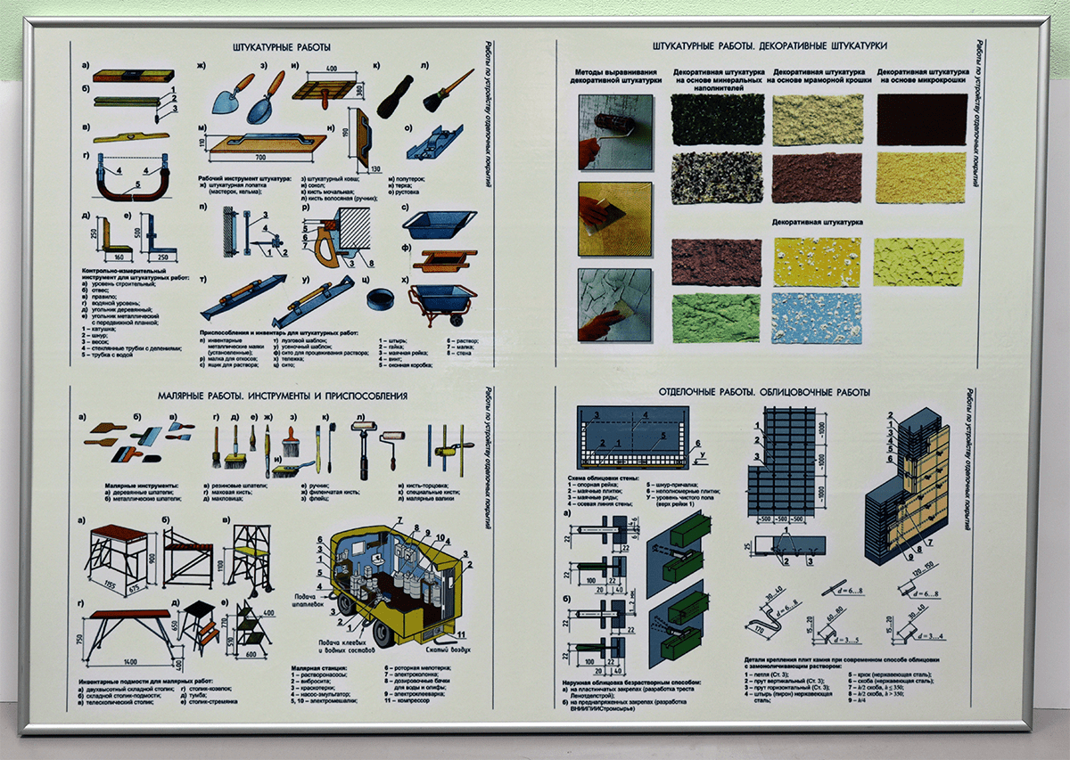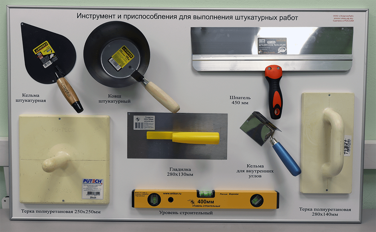 Количество макетов - 4 шт. - Планшет с инструментом и приспособлениями для выполнения штукатурных работ, предназначенных для демонстрации инструментов и приспособлений применяемых при выполнении штукатурных работ.