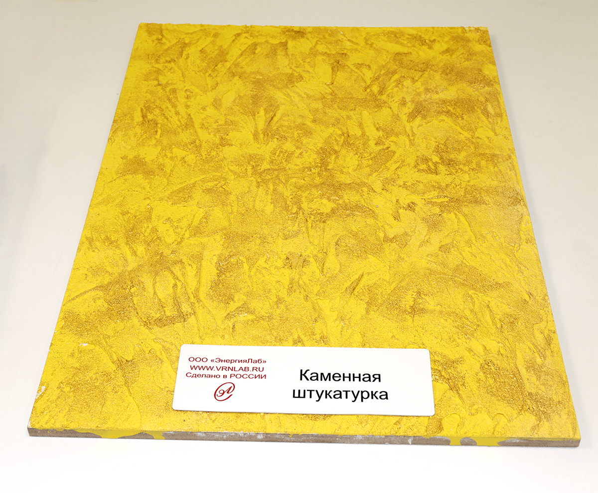 - Образец штукатурки нанесен на деревянную табличку, закрепленную на композитной панели.