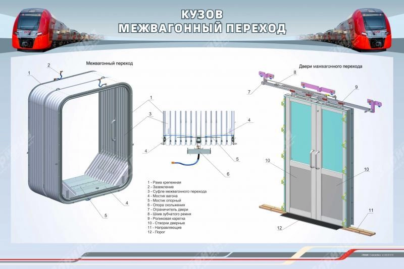 Стенд представляет собой полноцветную панель, на которой расположена информация по конструкции межвагонного перехода кузова вагона.