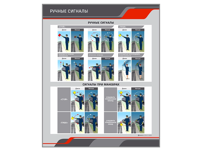 На стенде присутствуют изображения работника железной дороги, показывающего различные виды ручных сигналов и сигналов при маневрах.