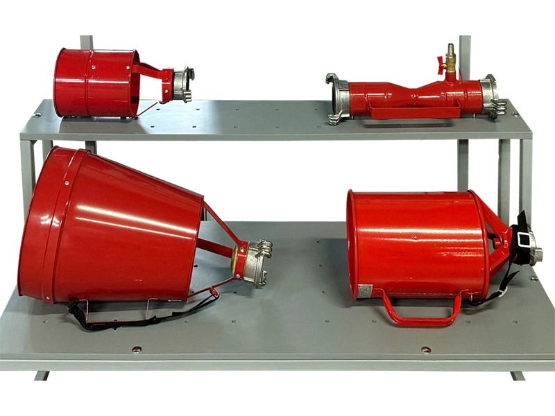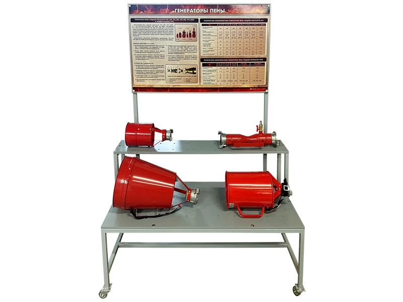 Учебное оборудование представляет собой основные применяемые виды генераторов пены и пеносмесителей, установленные на металлическом основании, и предназначается для ознакомления с основами применения водопенного оборудования.