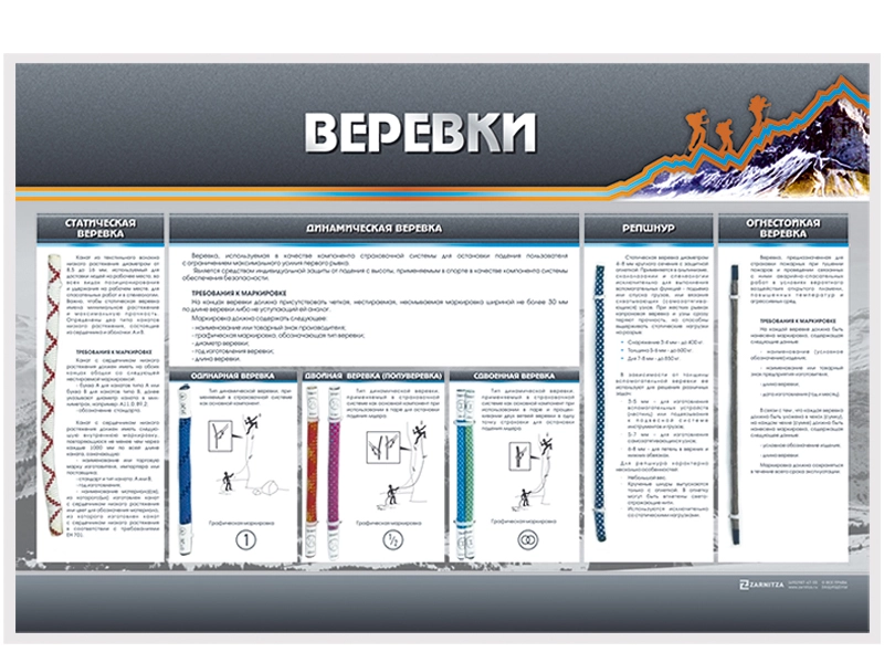 Образцы веревок изготовлены из сертифицированного альпинистского снаряжения (сертификация EN, UIAA, NFPA) и смонтированы на стенде. Кроме этого, на стенде размещаются надписи, обозначающие наименование веревки, а так же основные типы маркировок, располагающихся на концах веревок, и их расшифровки.