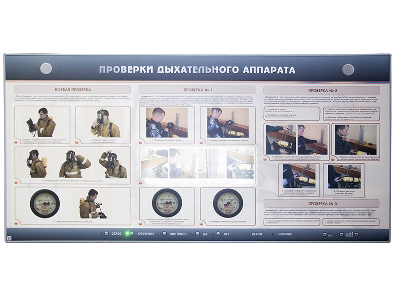 Электрифицированный стенд "Проверки дыхательного аппарата" представляет собой полноцветную светодинамическую панель, на которой отображена информация об этапах проверок дыхательного аппарата. В конструкцию учебного оборудования интегрированы высокочувствительные сенсоры для управления стендом при помощи интерактивного воздействия приемо-передающих устройств. Предусмотрено два режима работы со стендом: "Обучение" и "Контроль".