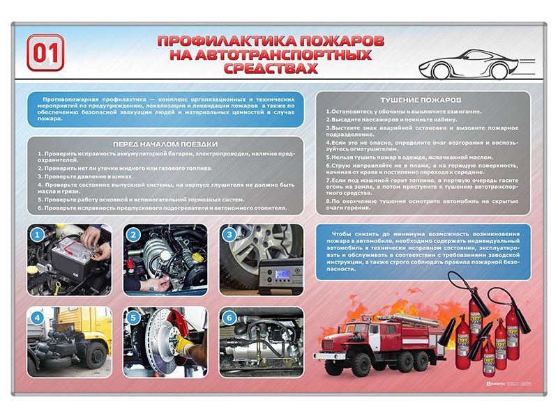 Стенд "Профилактика пожаров на автотранспортных средствах" представляет собой панель, на которой размещена информация о противопожарной профилактике, правилах тушения пожаров и проверке автотранспортного средства.