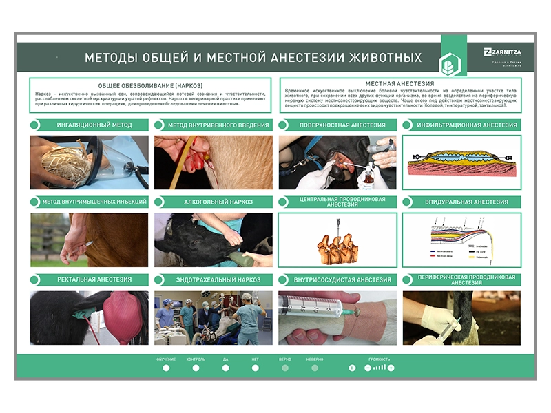 Электрифицированный стенд "Методы общей и местной анестезии" представляет собой полноцветную светодинамическую панель, на которой представлена информация о методах общей и местной анестезии. В конструкцию учебного оборудования интегрированы высокочувствительные сенсоры для управления стендом при помощи интерактивного воздействия приемо-передающих устройств. Предусмотрено два режима работы со стендом: "Обучение" и "Контроль".