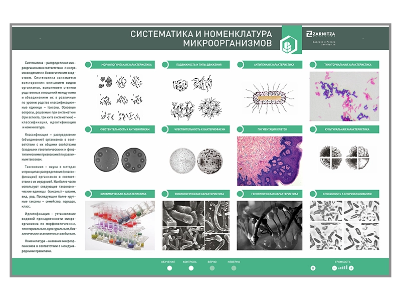 Электрифицированный стенд "Систематика и номенклатура микроорганизмов" представляет собой полноцветную светодинамическую панель, на которой представлена информация о систематике и номенклатуре микроорганизмов. В конструкцию учебного оборудования интегрированы высокочувствительные сенсоры для управления стендом при помощи интерактивного воздействия приемо-передающих устройств. Предусмотрено два режима работы со стендом: "Обучение" и "Контроль".