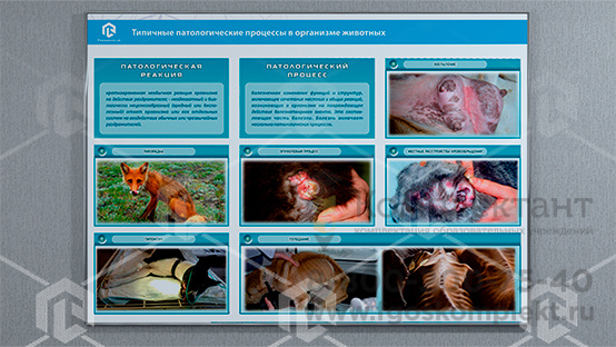 Лабораторный стенд "Изучение типических патологических процессов в организмах животных" представляет собой полноцветную светодинамическую панель, на которой представлена информация о типических патологических процессах животных.