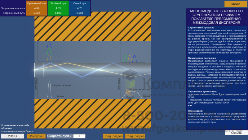 - Теоретический модуль «Волоконно-оптический кабель». Демонстрация и описание принципов работы оптического волокна и физических основ оптических явлений, встречающихся и использующихся в волоконно-оптических кабелях.