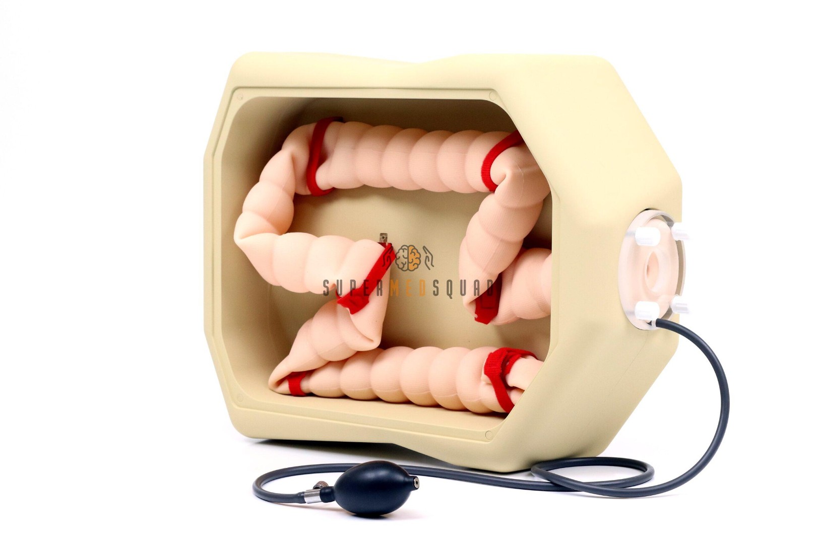 - В тренажере предусмотрены точки фиксации имитации кишечника, что позволяет создавать различные анатомические ситуации