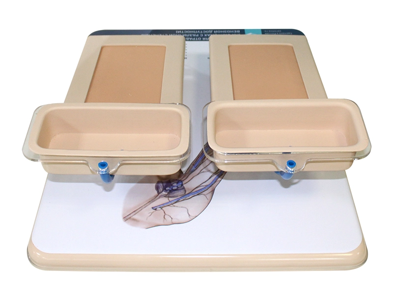 Контроль проведения процедуры осуществляется вытеканием жидкости, имитирующей кровь. Материал модуля визуально и пальпаторно напоминает кожу человека. На панели изображена сетка вен и артерий для отработки теоретических основ.