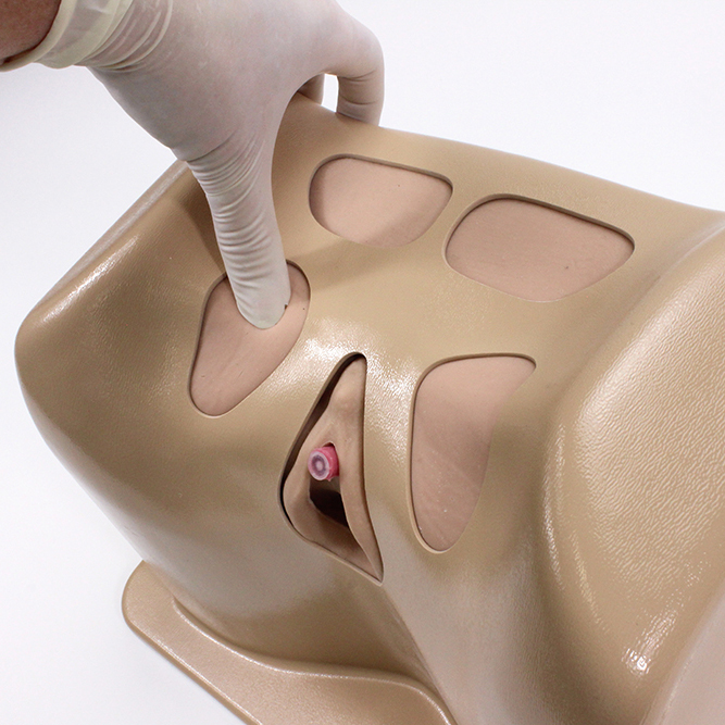 - Модель представлена в виде блока с основанием, воспроизводящим анатомию промежности для отработки навыков слинговой уретропексии