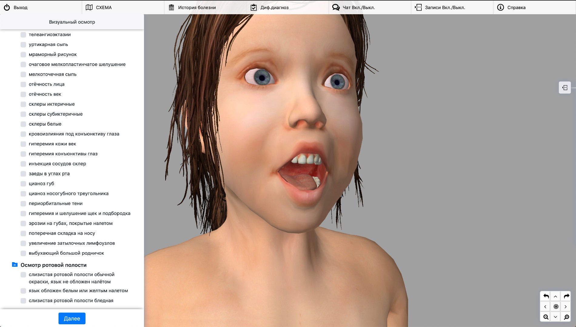 Обследование пациента осуществляется в условиях виртуального кабинета участкового педиатра. Диалог с персонажем реализован в виде текстового чата с возможностью добавления информации в электронную историю болезни.