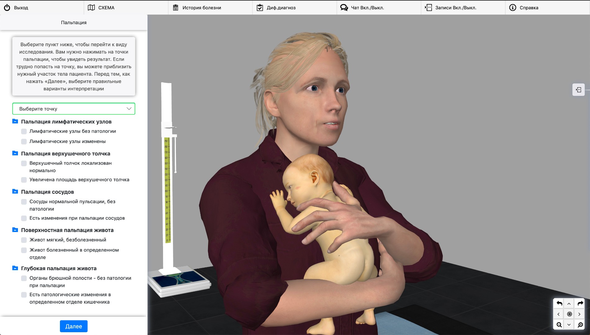 Пользователь имеет возможность указать на стандартные точки на теле ребенка, в которых необходимо провести пальпацию или перкуссию с последующим отображением результата на экране. Этап аускультации сопровождается воспроизведением соответствующих аудиофайлов для каждой выбранной точки.