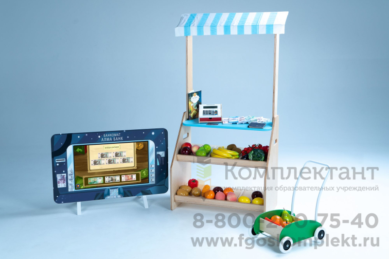 - Дополнительная атрибутика. Детский киоск АЛМА “”Магазин”” с кассой, тележкой и продуктами. Макеты денег и пластиковых карт, копилки, кошельки, наборы для игры в группе на тему уроков