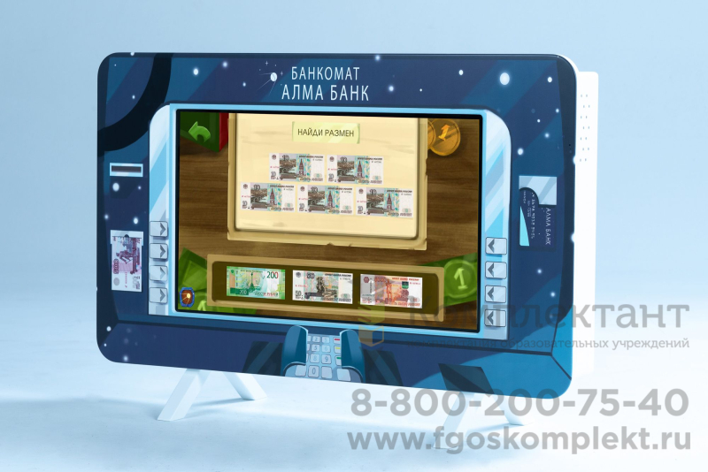 - Терминал АЛМА “”Банк””. Интерактивный терминал банкомата с диагональю экрана 25 дюймов, поддержкой одновременной работы до 4 детей, прочным корпусом и экраном, тематическим оформлением в виде банкомата