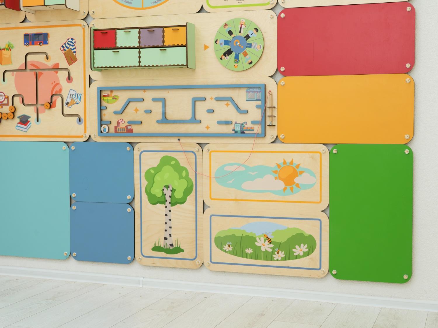 Дидактические панели отлично дополняют наборы цветных и иллюстрированных стеновых панелей, которые позволят оформить всё помещение в едином стиле.