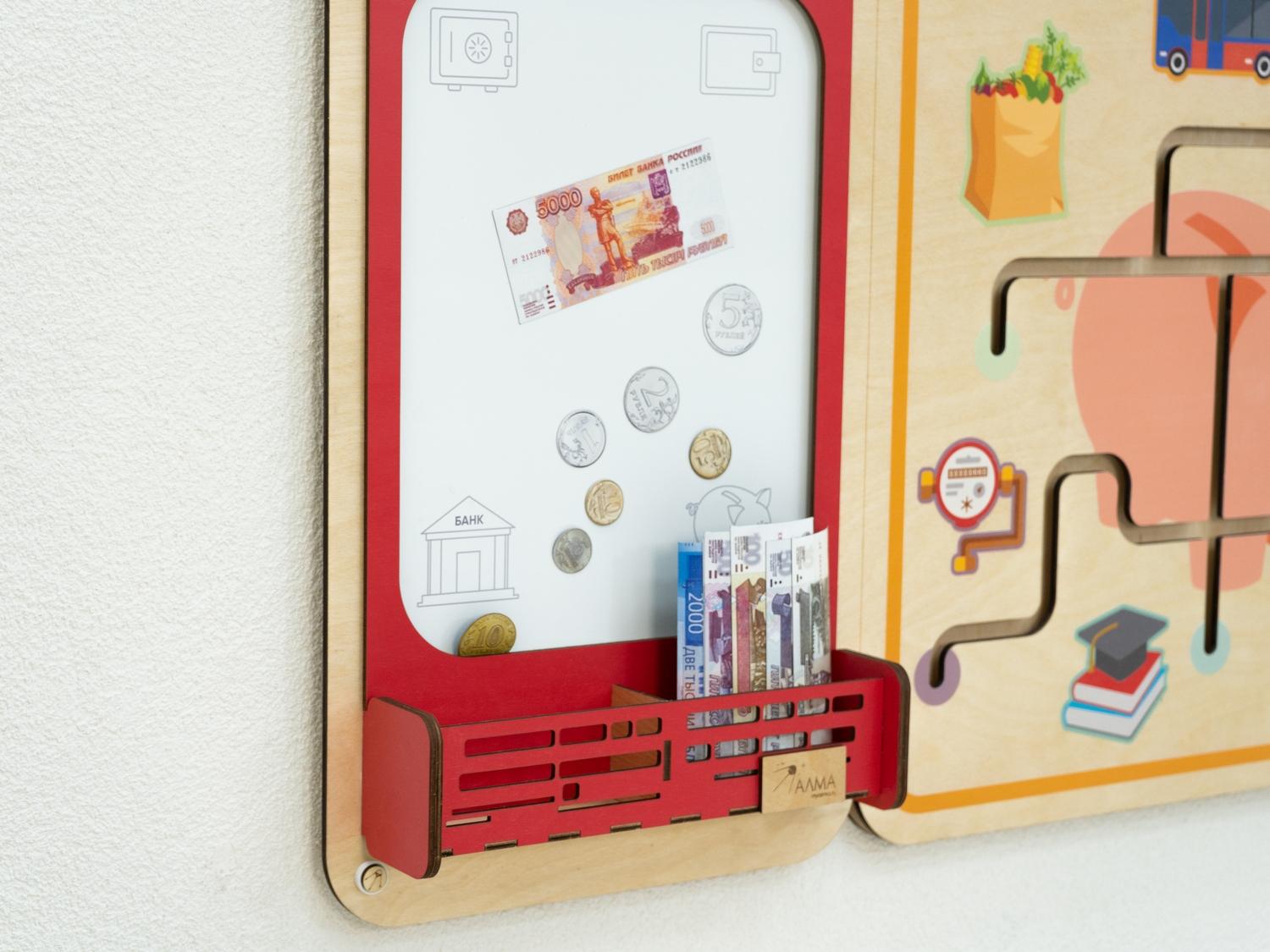 Панель увеличивает площадь полезного развивающего пространства в детском саду. Повесьте её на стену – и она не только станет незаменимым подспорьем в занятиях по финансовой грамотности, но и украсит помещение, скрывая дефекты стен.