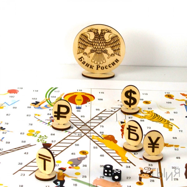 3) Фигурки для настольной игры в виде фишек с нанесенными графическими изображениями валют мира (6 шт.);