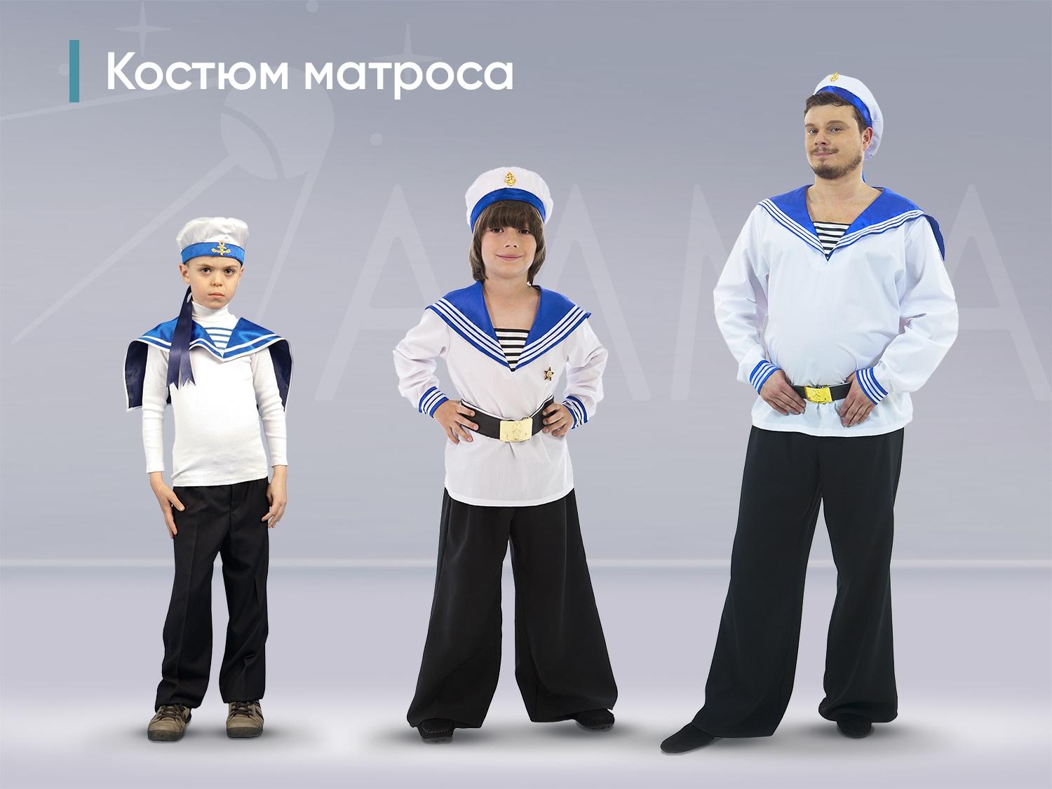 - Костюм матроса (для малышей, детский, подростковый, взрослый). Размеры: 80-89,86-92,92-98,104-110,116-122,128-134,140-146,152-158,164-170,176,182. Цвет: белый с синим.