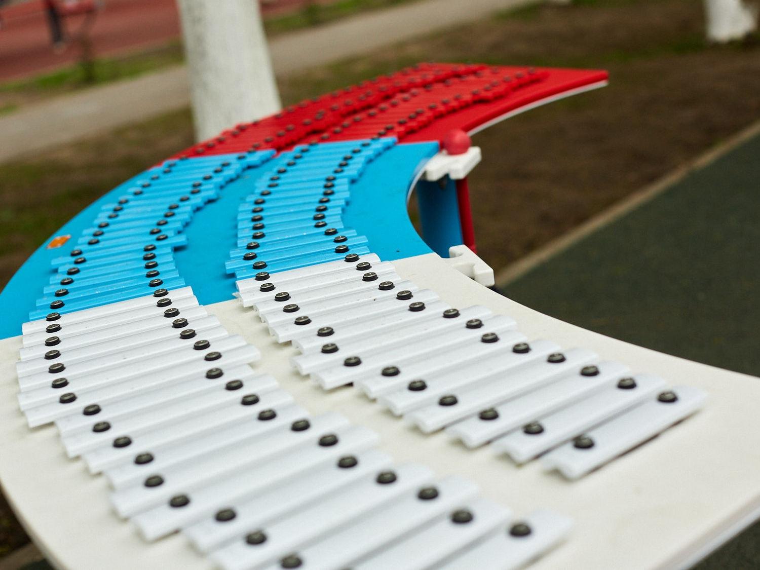 Металлофон в цветах российского триколора, нотные пластины музыкального инструмента расположены так, что любой пользователь может сыграть гимн России без предварительной музыкальной подготовки и пропеть его, пользуясь текстом, нанесенным на клавиши.