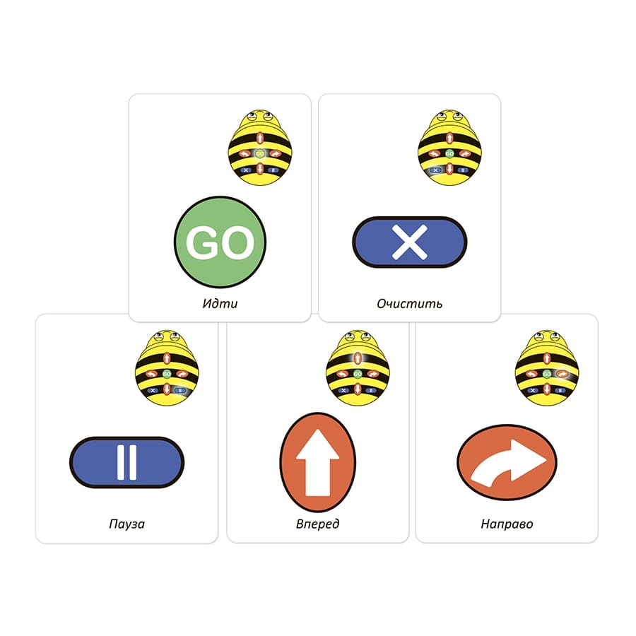 Мини-робот Bee-Bot (Blue-Bot) - это не только очень популярная и любимая детьми за простое управление и яркое, красочное оформление игрушка, но и прекрасное игровое средство развития и обучения детей, широко используемое в дошкольных образовательных организациях. Для ознакомления детей с командными кнопками управления мини-роботов Bee-Bot (Blue-Bot), а также для проведения занятий по составлению алгоритмов программирования мини-роботов разработан набор карточек с изображением командных кнопок, для создания алгоритмов программирования. Набор состоит из красочно оформленных карточек формата А7, выполненных из плотной мелованной бумаги. Каждая карточка содержит изображение мини-робота Bee-Bot (вид сверху), а также изображение одной из командных кнопок программирования мини-робота в увеличенном масштабе, а также надпись на русском языке, соответствующая команде программирования мини-робота. Для возможности создания последовательности из нескольких разных команд в составе набора, а также работы в группе предлагается 51 карточка, в том числе: