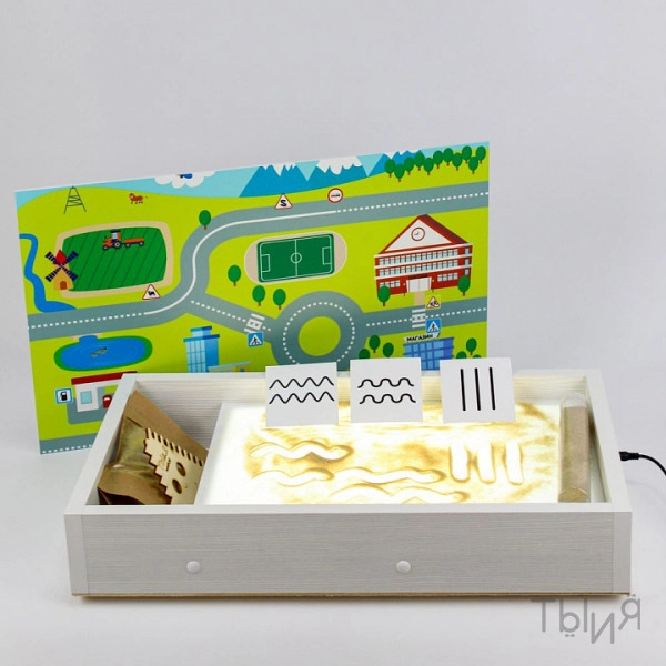 Световой-планшет, песок, подсветка, яркий корпус, отсек для инструментов и песка.