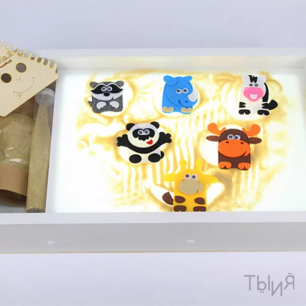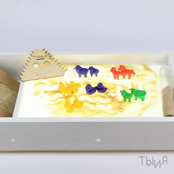 В комплекте: световой планшет, крышка, песок, подсветка, яркий корпус, отсек для инструментов и песка.